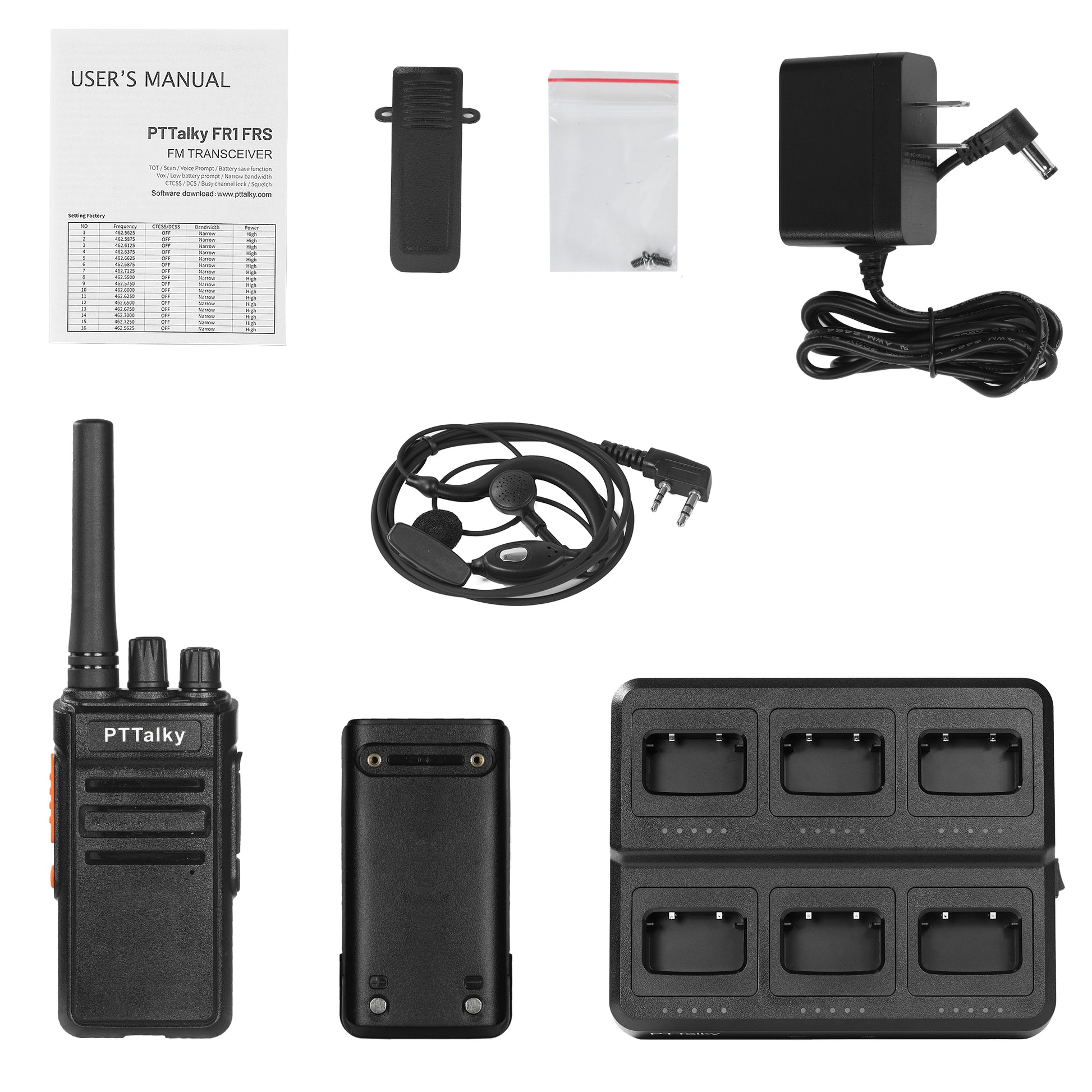 - FR1 PLUS walkie talkies*6, 1200mAh lithium lon battery and belt clips*6, earpieces*6, six way gang multi charger*1, ac adapter*1, user manual*1
