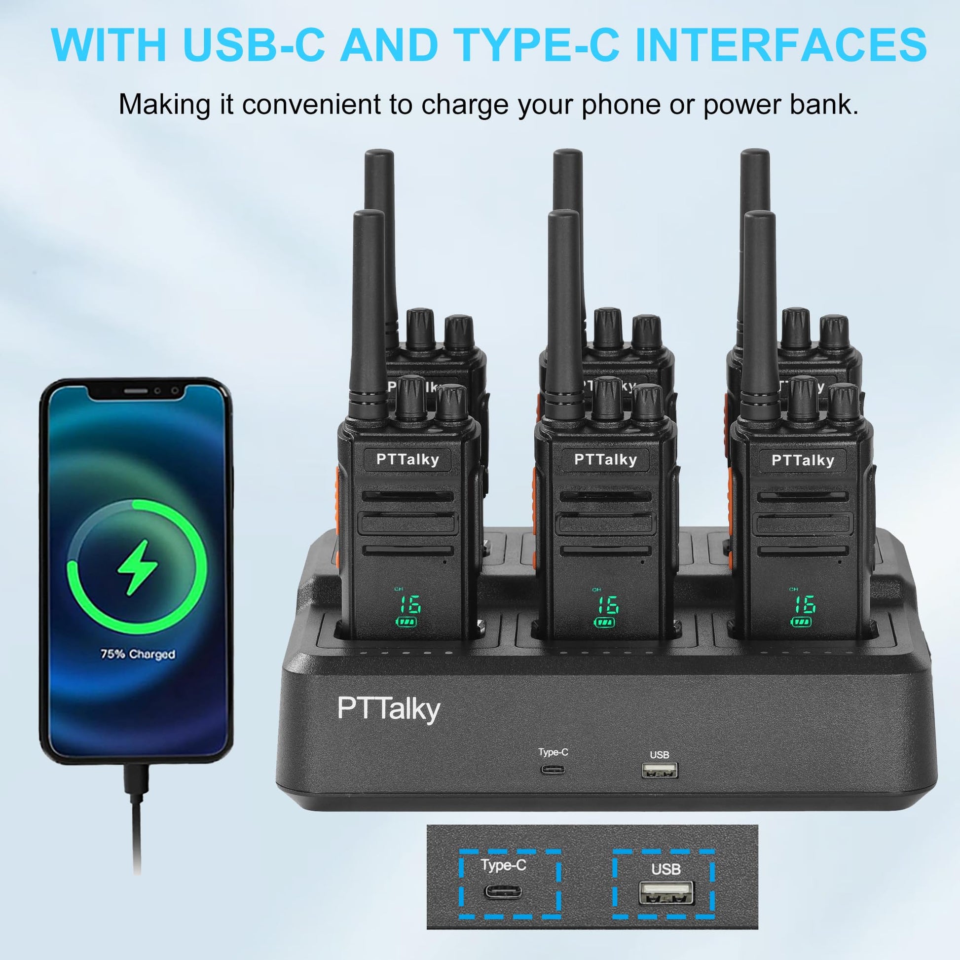 - Charging Efficiency: 6-Way Charger – Charges 6 radios/batteries simultaneously team-friendly. USB & Type-C ports for phones power banks.